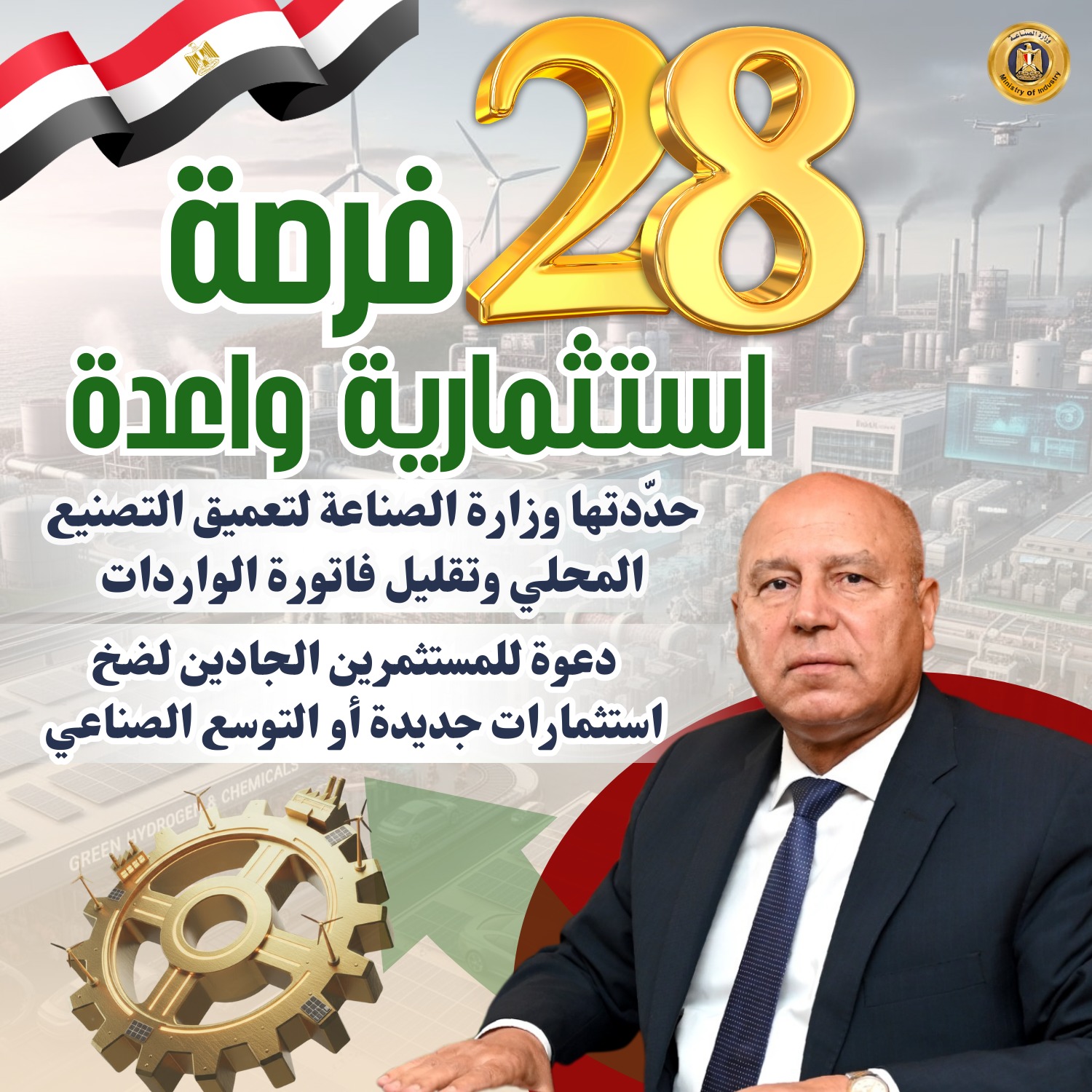 حددت وزارة الصناعة 28 صناعة وفرصة استثمارية واعدة ومستهدفة لجذب استثمارات بها بهدف تلبية احتياجات السوق، وتقليل فاتورة الواردات، وتدعو الوزارة المستثمرين الجادين لضخ استثمارات جديدة أو التوسع في هذه الصناعات الواعدة والمستهدفة التي توليها الوزارة اهتماماً بالغاً.
