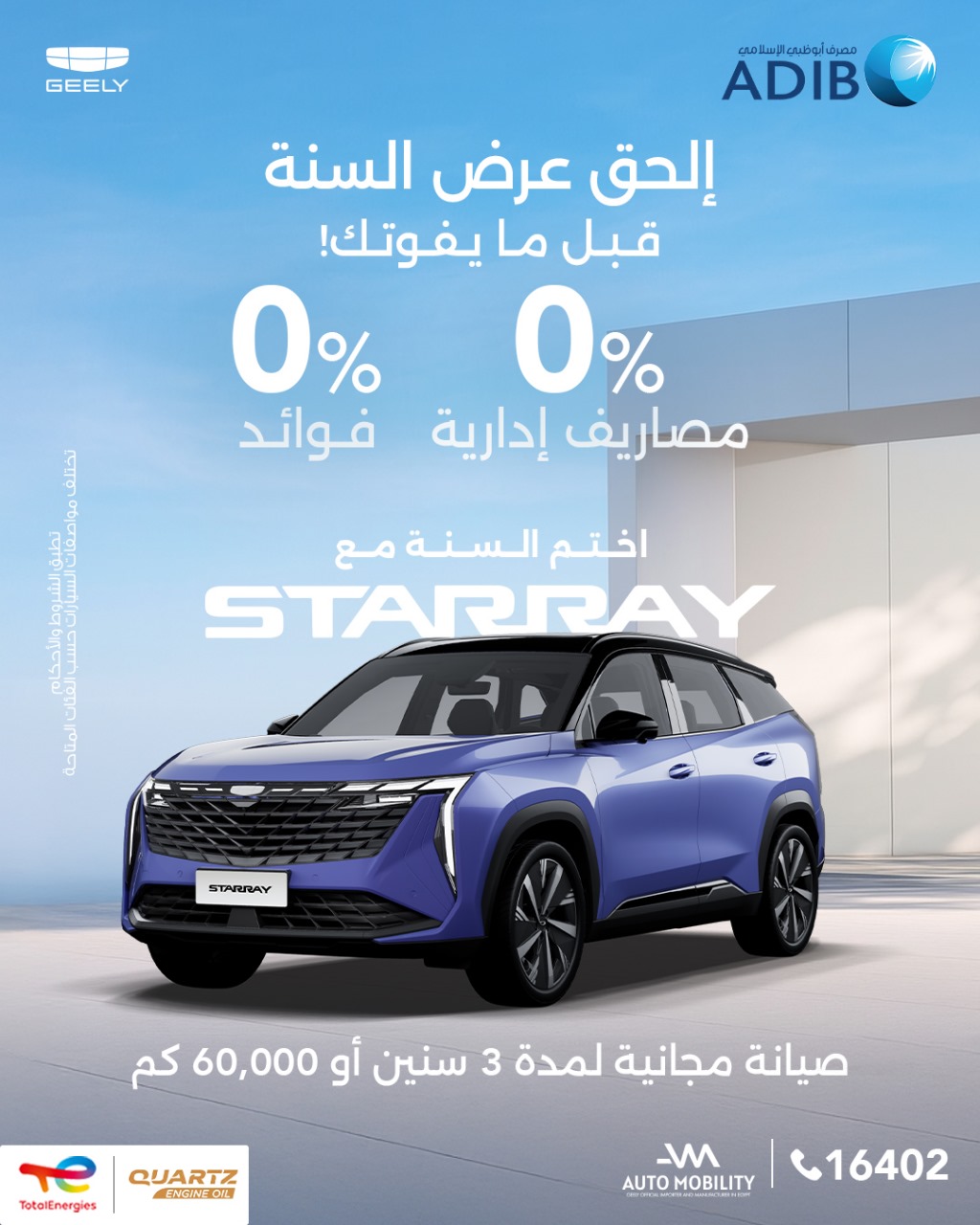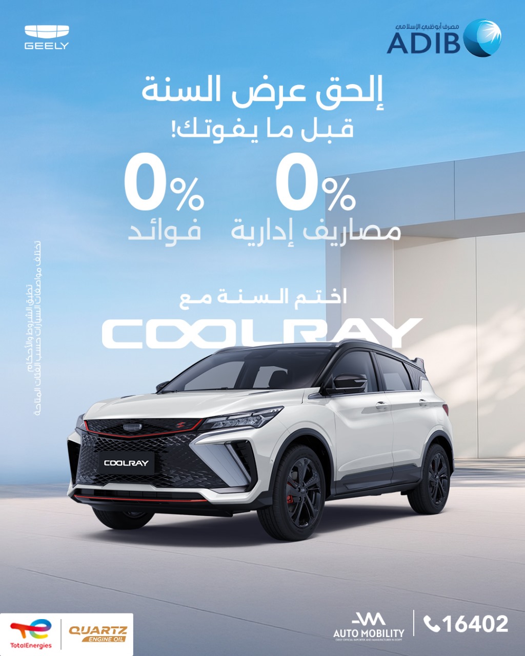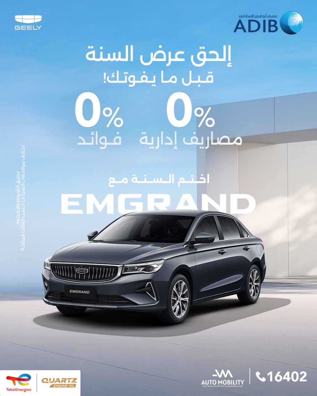 انطلاقًا من حرصها على توفير أفضل الخدمات والحلول التمويلية لعملائها طوال العام، أعلنت "أوتوموبيلتي" -الوكيل الرسمي والمُصنَّع الحصري لسيارات جيلي في مصر- عن عرض تمويلي حصري مميَّز لعملاء العلامة الصينية المرموقة، بالتعاون مع مصرف أبوظبي الإسلامي (ADIB) الذي يُقدِّم باقة متنوِّعة مِن الخدمات التمويلية المتوافقة مع الشريعة الإسلامية.