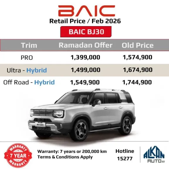 أعلنت شركة "ألكان أوتو"، الوكيل الرسمي لعلامة "بايك" (BAIC) في مصر، عن القائمة السعرية الجديدة لسياراتها لشهر فبراير 2026. وتضمنت القائمة مفاجأة قوية لعملاء السوق المصري متمثلة في "عروض رمضان" التي شملت تخفيضات سعرية ملحوظة على طراز BJ30 الجديد، بالإضافة إلى استمرار ضمانها الممتد لـ 7 سنوات أو 200,000 كم.